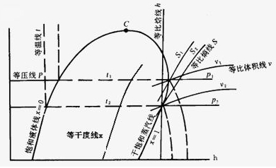 (3)等溫線:圖上用點(diǎn)劃線表示的為等溫線。等溫線在不同的區(qū)域變化形狀不同,在過(guò)冷區(qū)等溫線幾乎與橫坐標(biāo)軸垂直;在濕蒸氣區(qū)卻是與橫坐標(biāo)軸平行的水平線;在過(guò)熱蒸氣區(qū)為向右下方急劇彎曲的傾斜線。